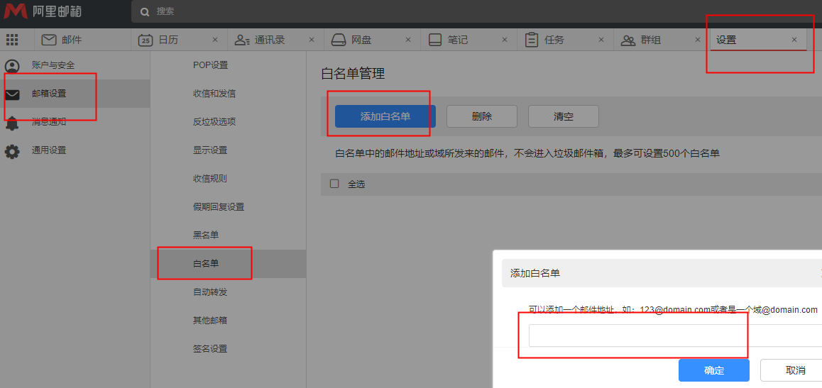 1、登录邮箱后点击右上角“邮箱设置”,在左侧展开设置功能列表中点击“黑名单”或“白名单”添加即可。