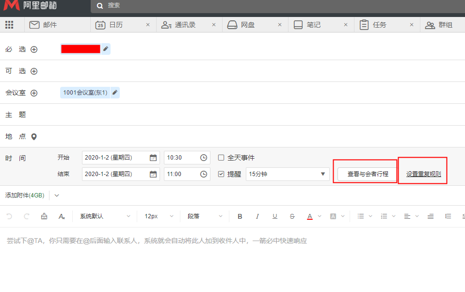 2、输入必选及可选参会者,同时可查看与会者的时间计划,输入会议主题、地点、时间。还可选择提醒时间,如是固定会议可通过“重复规则”选择会议频率,最后输入会议简要点击发送邀请。
